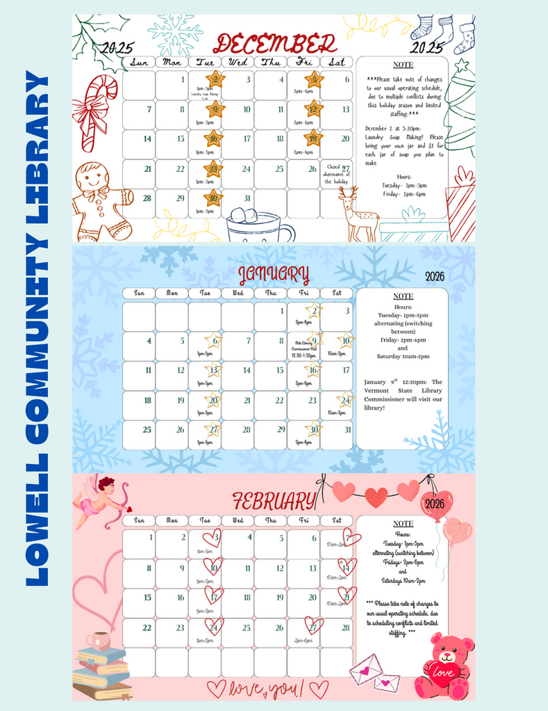 The Lowell Library is located at the Town Clerk's Office at 2170 VT Rte. 100.